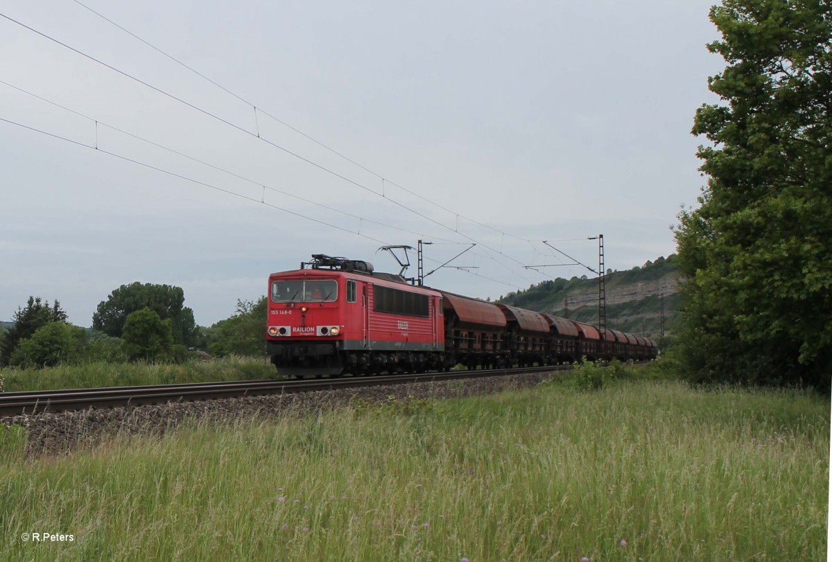 155 148-0 zieht kurz vor Thüngersheim ein kurzen Getreidezug. 02.06.15