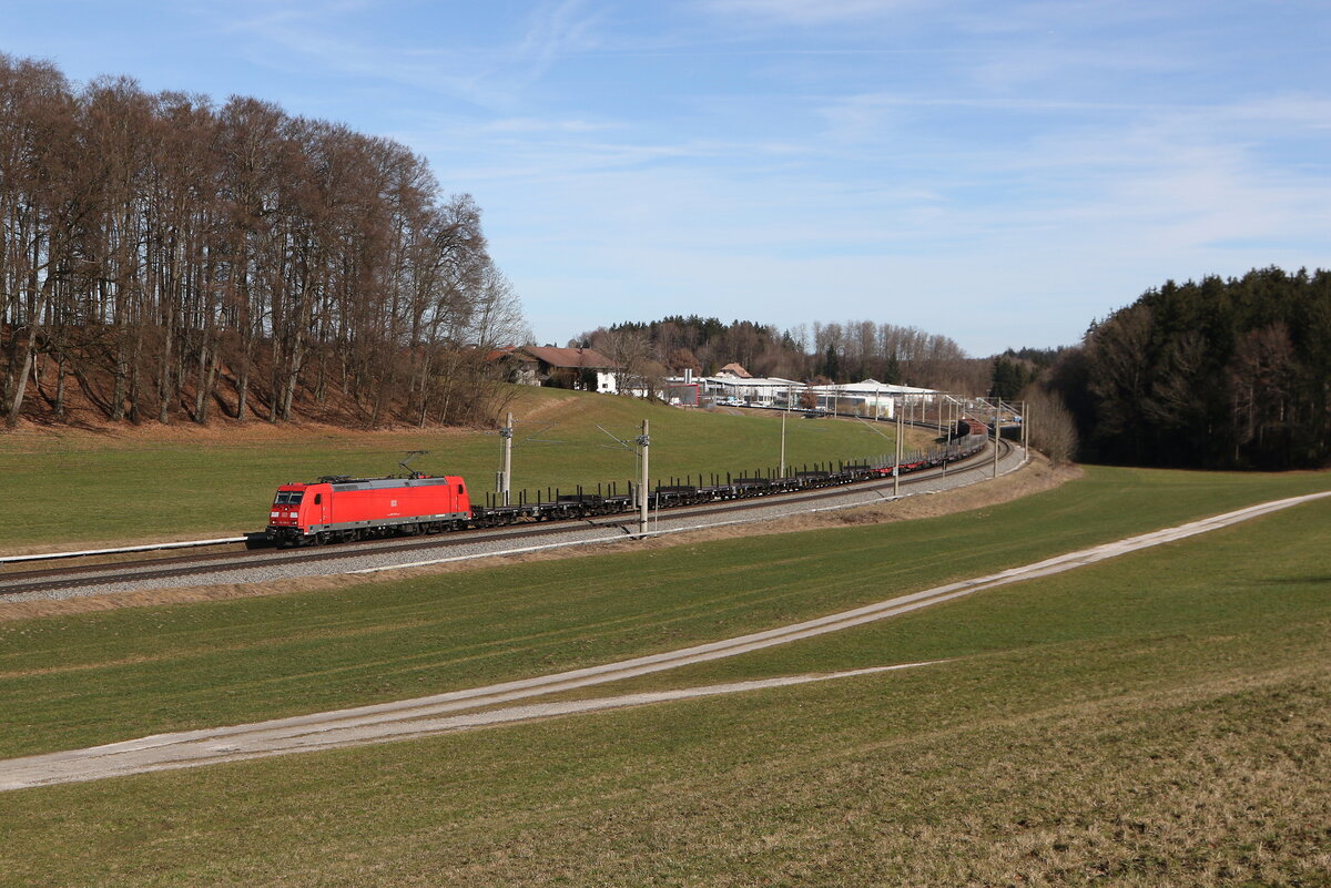 185 340 "Aus dem Rheinland nach Europa" von Rhein Cargo" mit einem Kesselwagenzug am 19. März 2020 bei Grabenstätt.