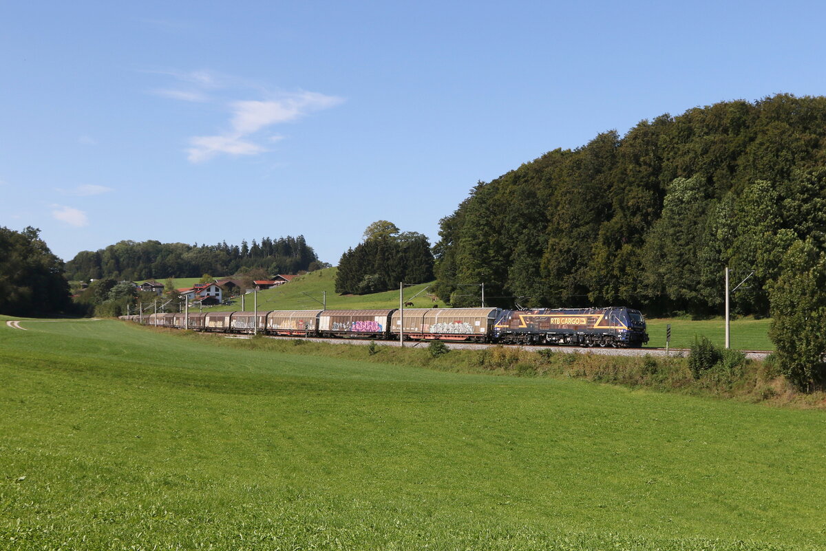 193 999 von "Rurtal Bahn Cargo" mit einem Autozug am 7. August 2022 bei Himmelstadt am Main.