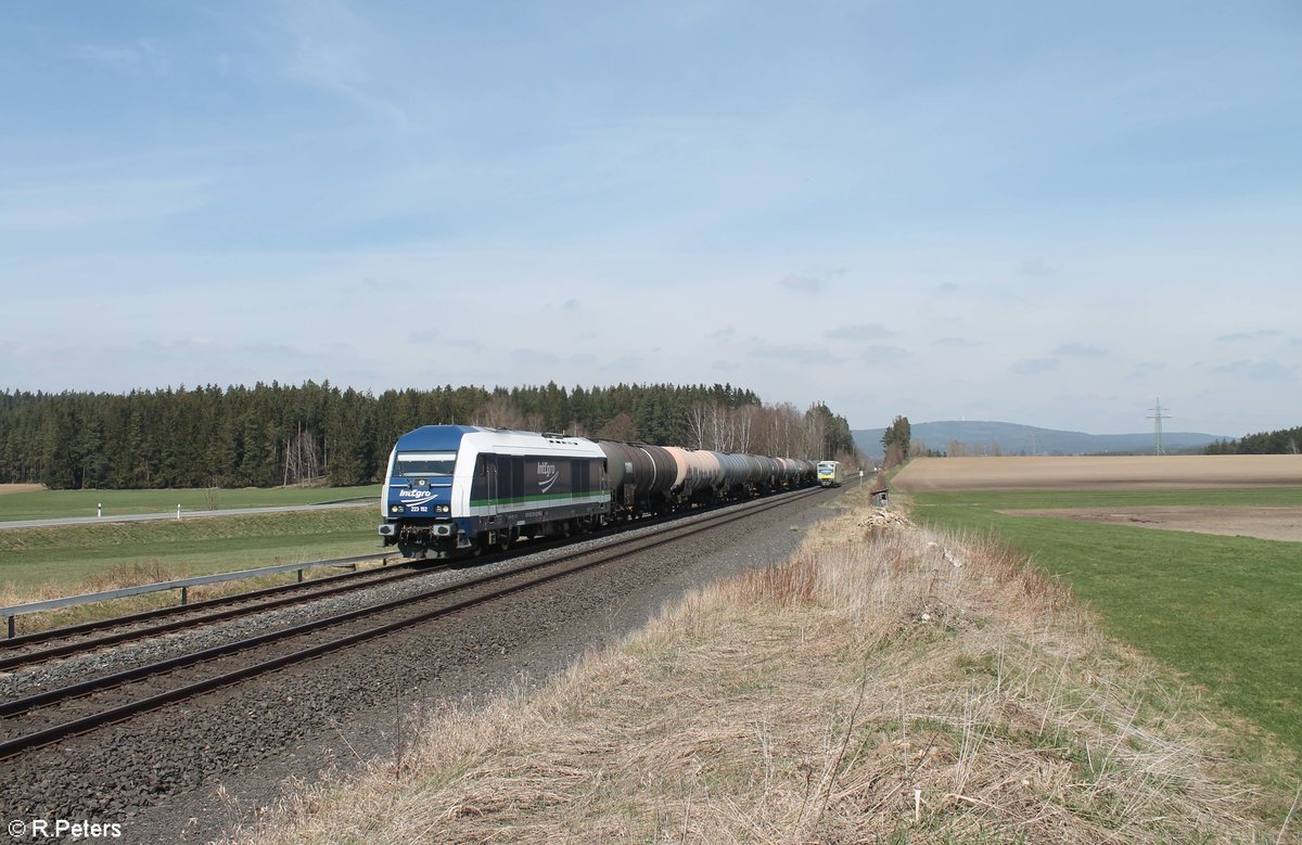 223 152 zieht kurz vor Reuth bei Erbendorf ein Kesselzug nach Weiden West zum Hauer. 27.04.21