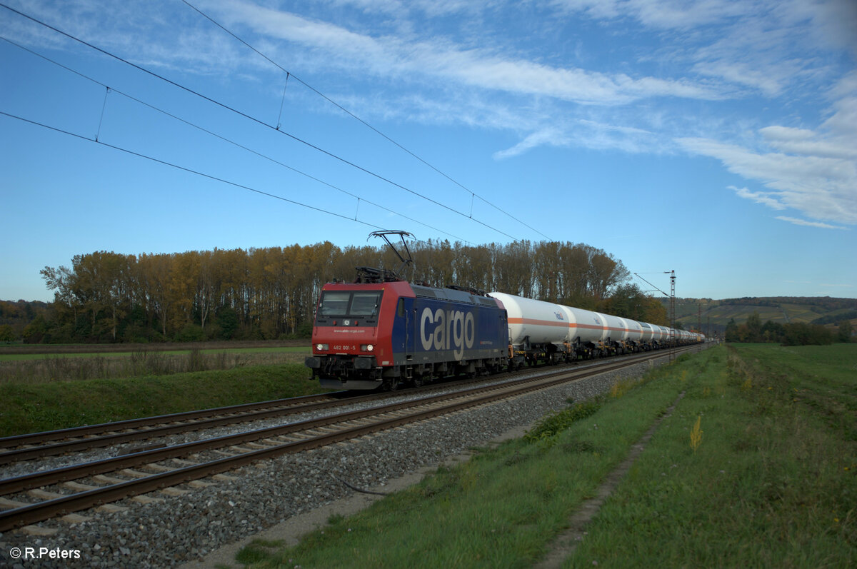 482 001-5 zieht mit einem Gaskesselzug bei Retzbach-Zellingen in Richtung Süden. 21.10.24