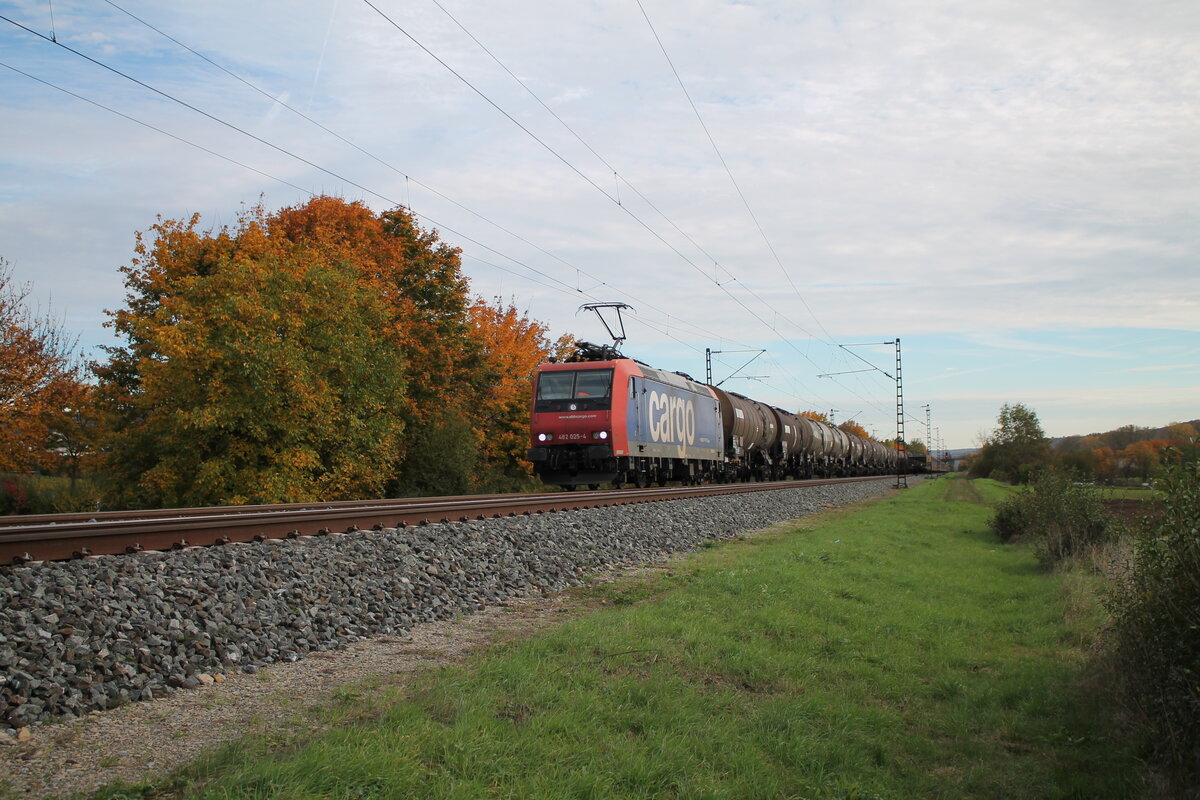 482 025-4 zieht mit einem Gaskesselzug bei Thüngersheim in Richtung Norden. 21.10.24