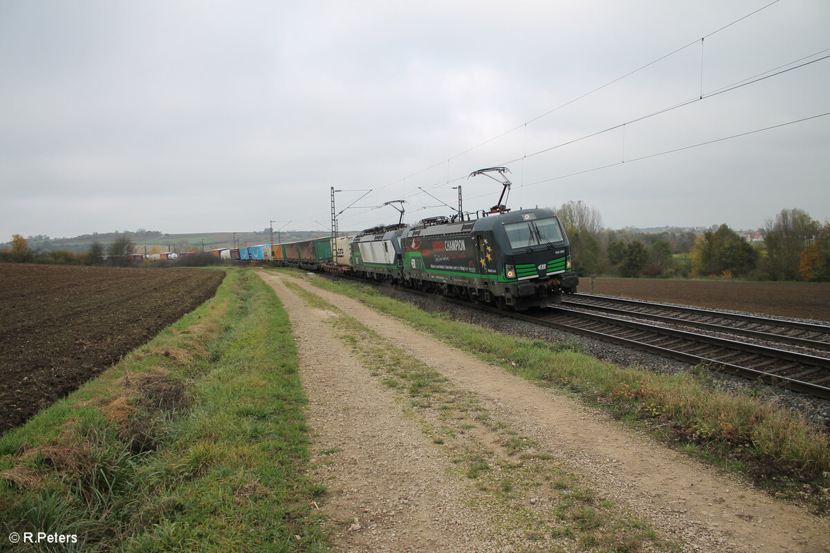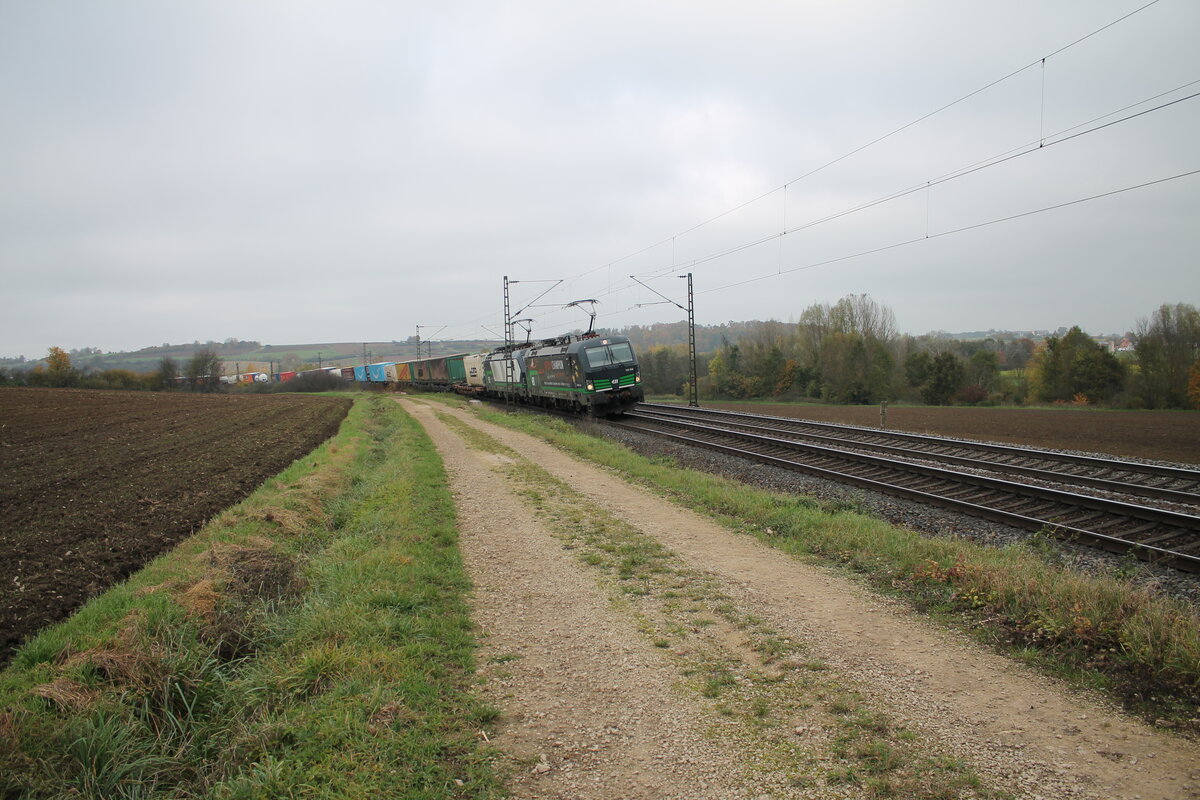 193 203 "Hidden Champion" und eine Schwester Maschine erreichen Treuchtlingen mit einem Wechselpritschenzug. 01.11.24