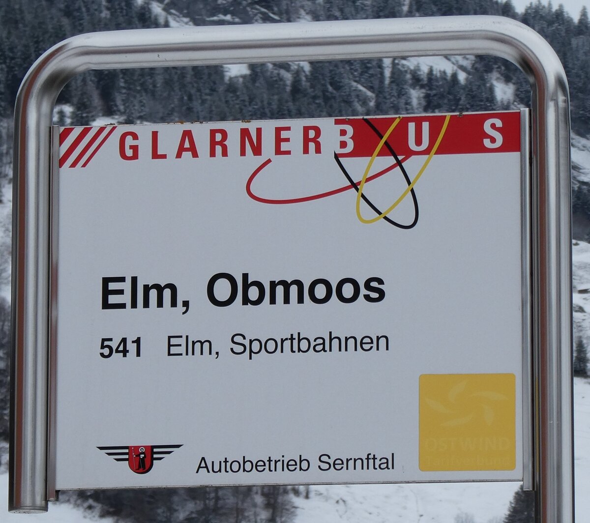 (284'449) - GLARNER BUS/Autobetrieb Sernftal-Haltestellenschild - Elm, Obmoos - am 30. Januar 2026
