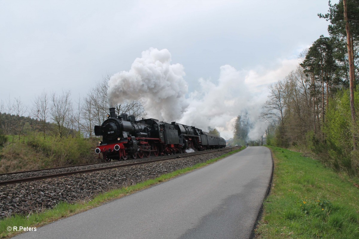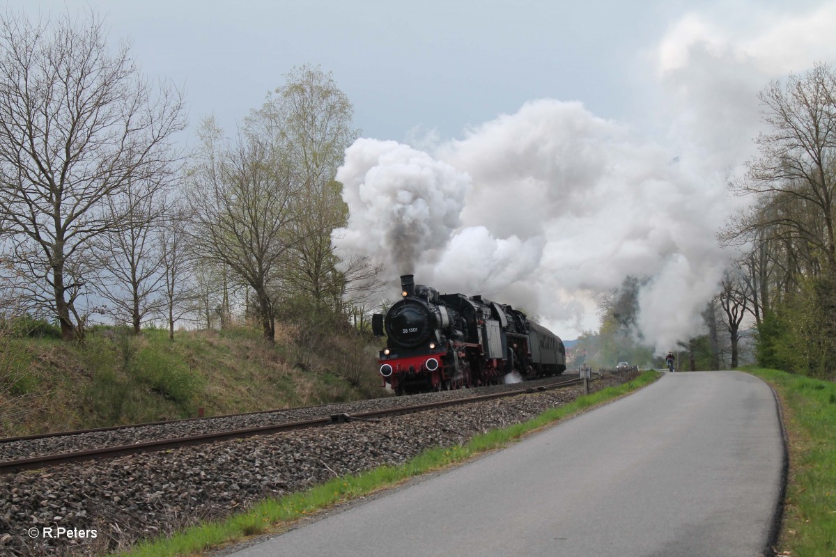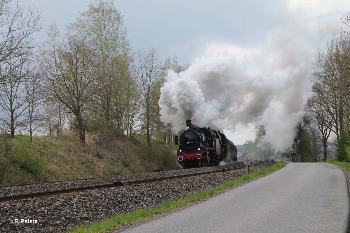 38 1301 beschleunigt ihren Sonderzug aus Linz nach Dresden bei Schönfeld zu Wiesau. 11.04.14