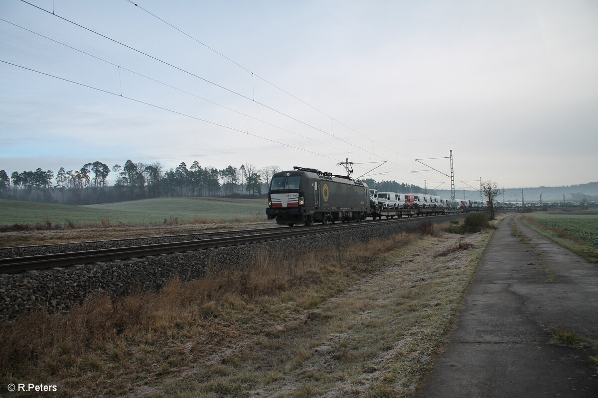 Was aus der einst Werbelok 193 875  Connecting Europe  geworden ist, ist nur der Schriftzug an der Front, hier zieht sie kurz vor Retzbach-Zellingen ein KLV Zug. 28.12.24