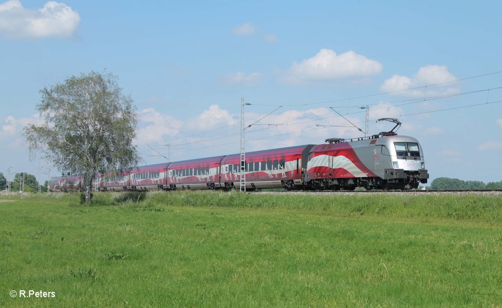 1116 249-4 schiebt den RJ69 München  - Wien Westbahnhof bei Pulling bei Freising. 08.06.13
