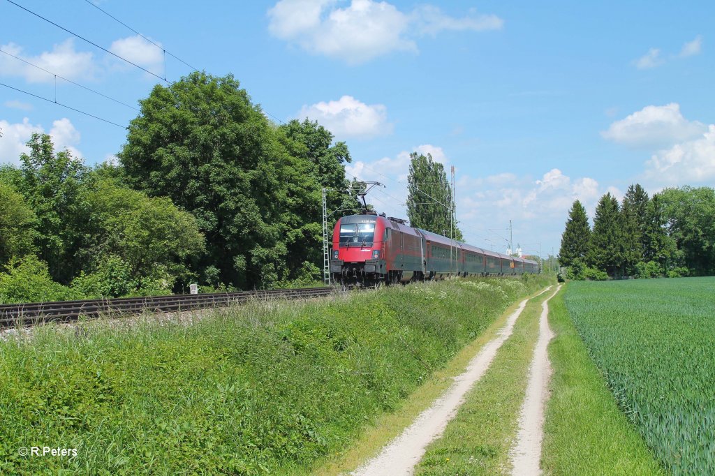 1116 249-4 schiebt den RJ69 München - Wien Westbahnhof bei Pulling bei Freising. 08.06.13