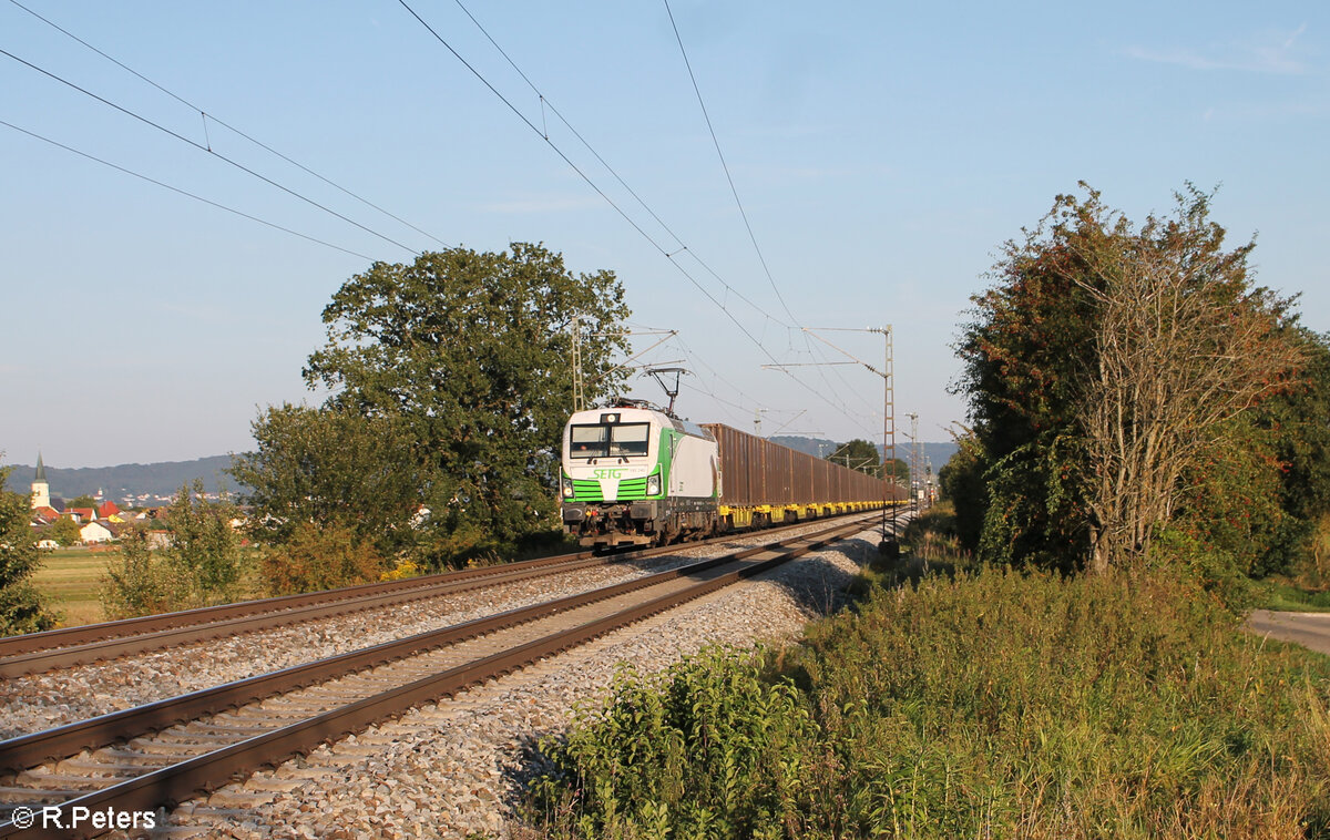 193 691-3 "Bertha von Suttner - Waffen Nieder" zieht bei Treuchtlingen ein leeren SFlexwood Zug in Richtung Norden. 01.11.24
