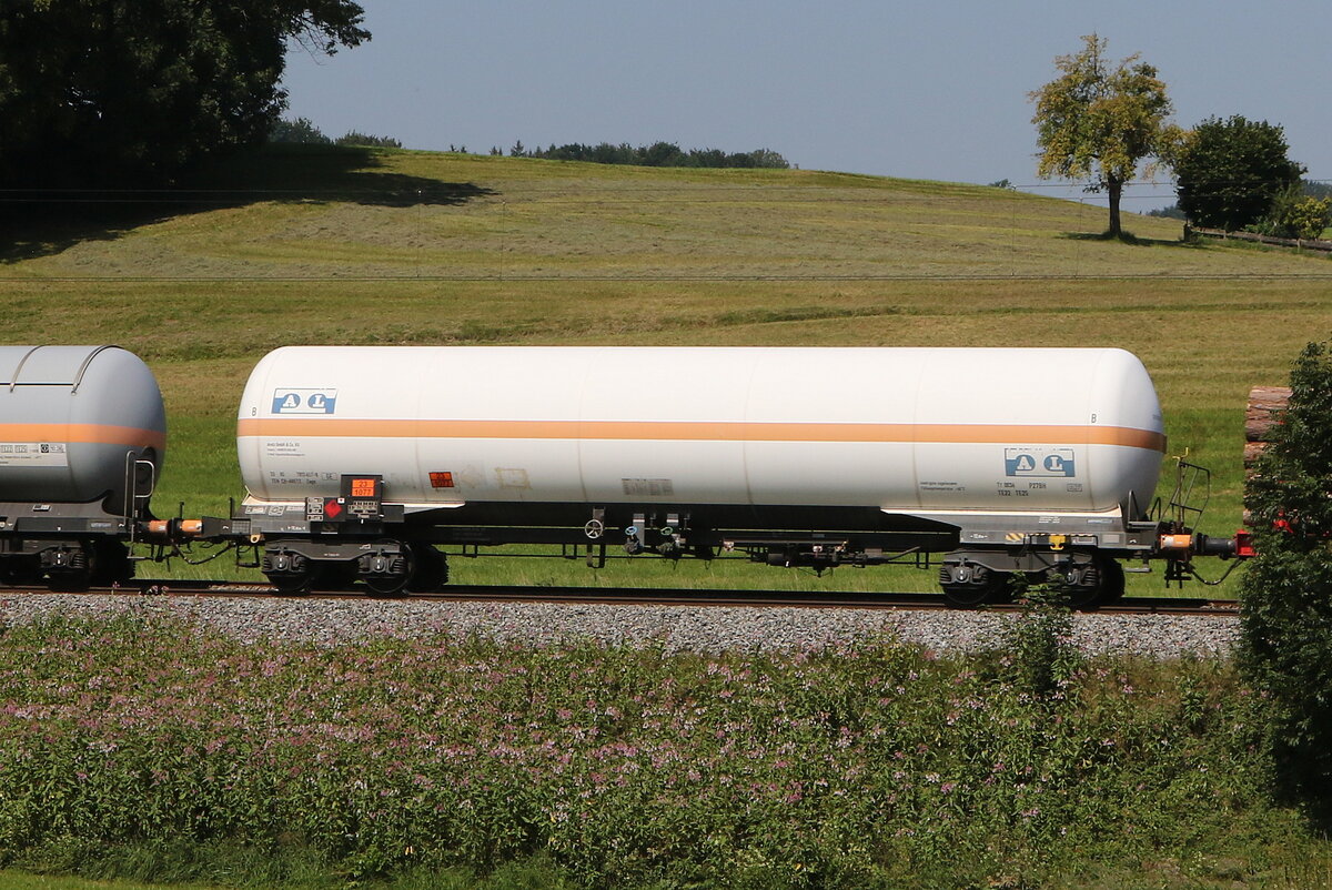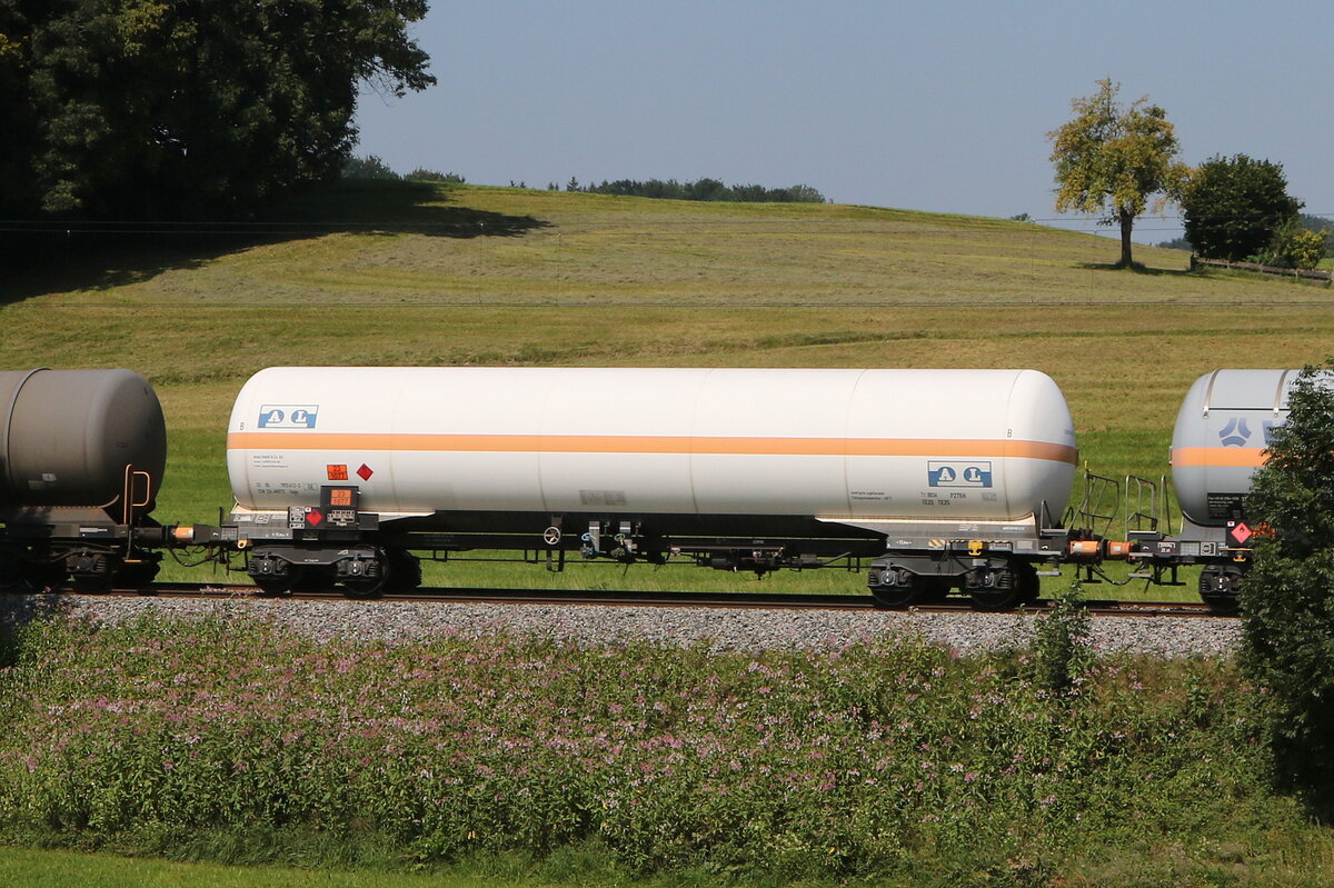 482 014 mit einem Druckgaskesselwagenzug aus Gemünden kommend am 8. August 2022 bei Himmelstadt im Maintal.